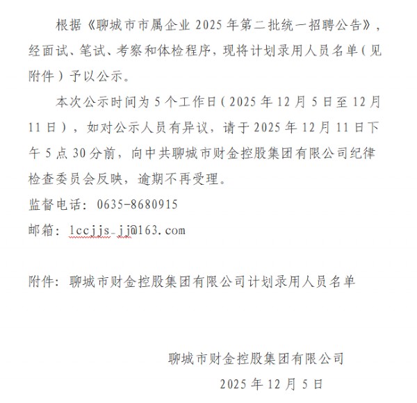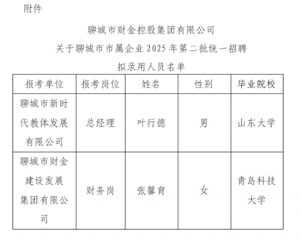 聊城市财金控股集团有限公司关于聊城市市属企业2025年第二批统一招聘公告拟录用人员公示